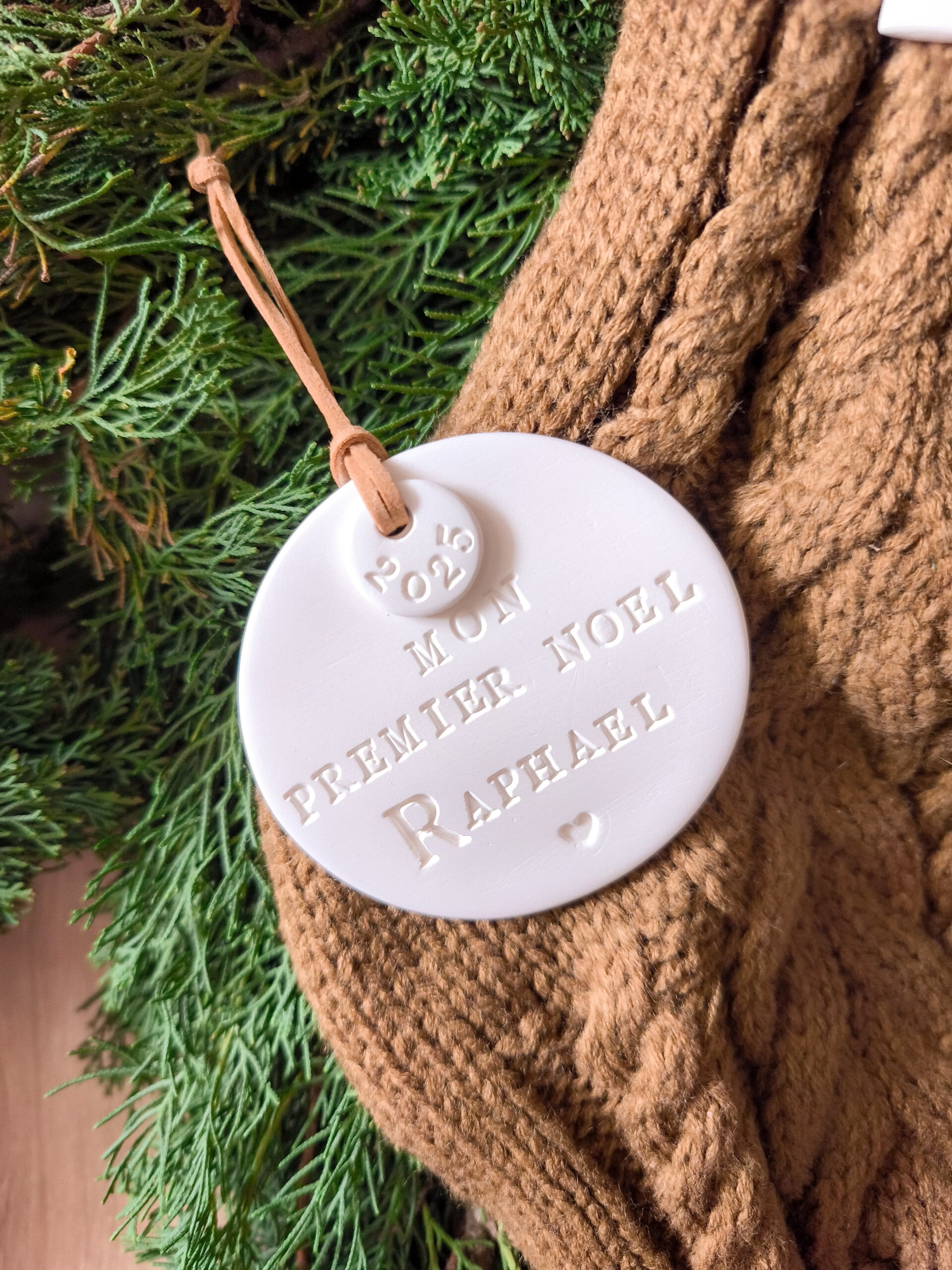 Ajoutez une touche de magie et de personnalisation à votre Noël avec notre suspension en argile « Mon Premier Noël ».