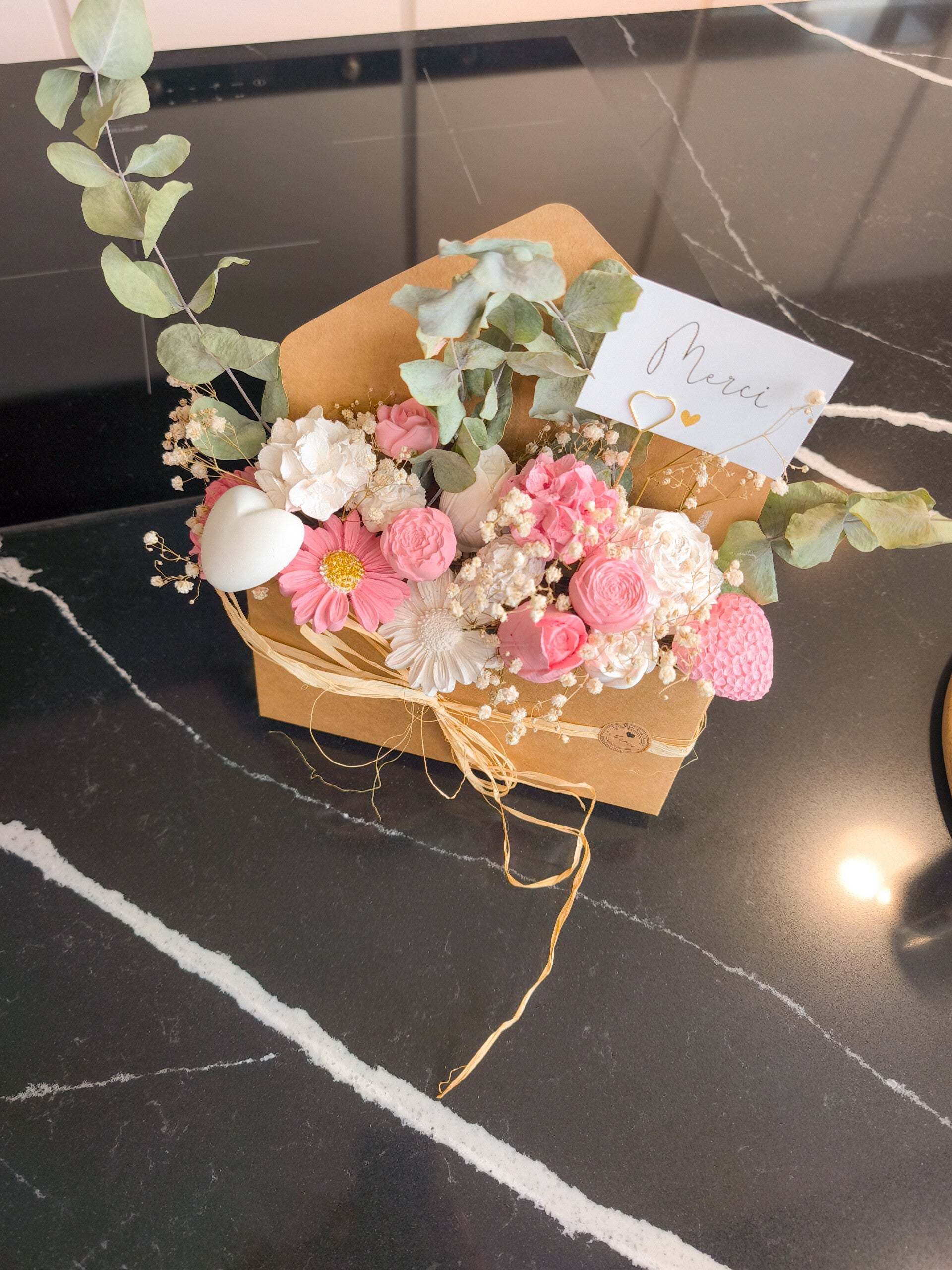 - Fleurs séchées naturelles : eucalyptus et gypsophiles